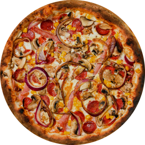Paradajkový základ, šunka, kukurica, šampiňóny, syr